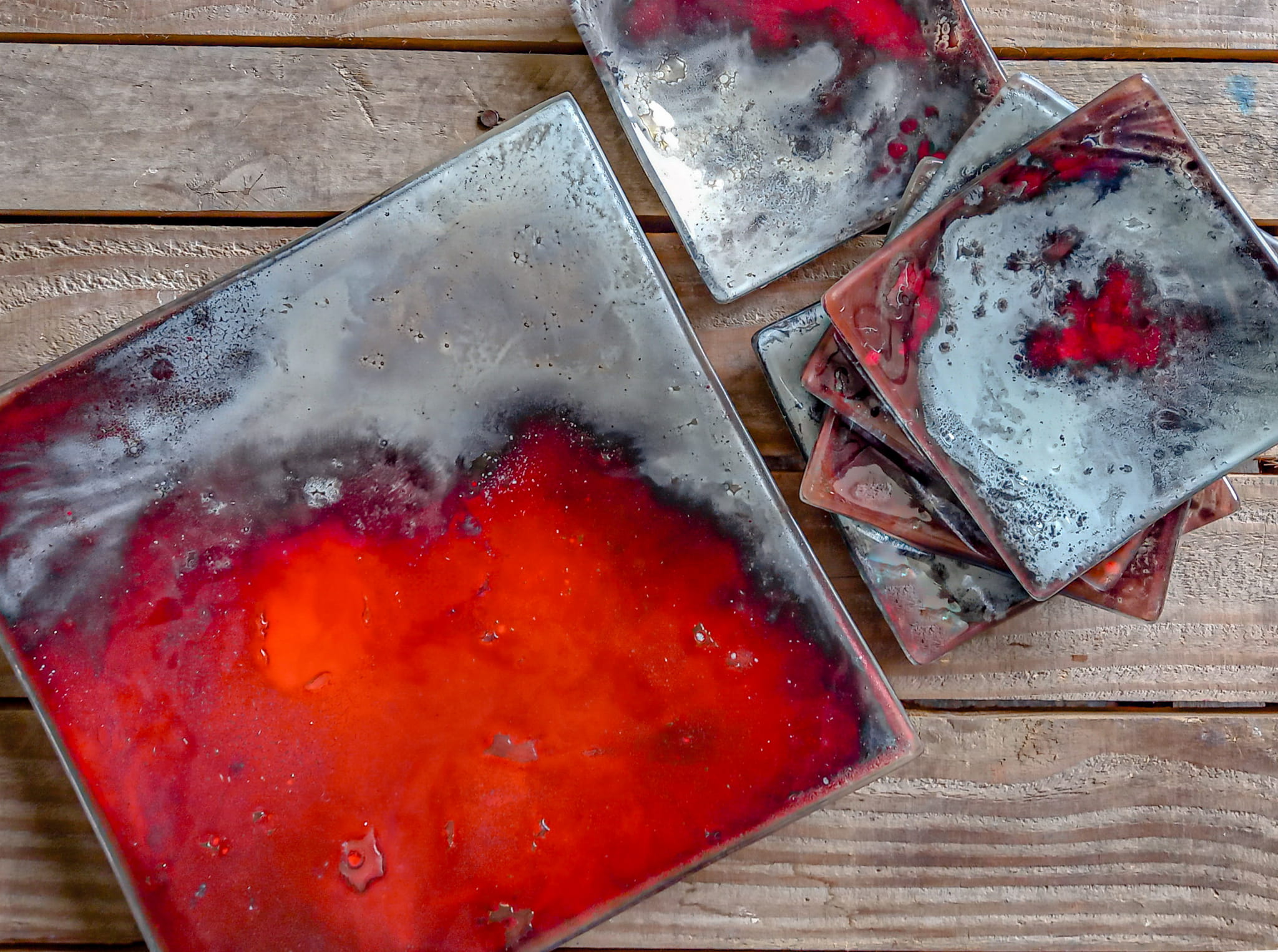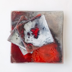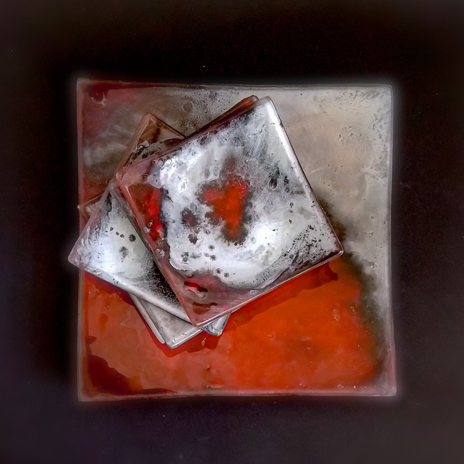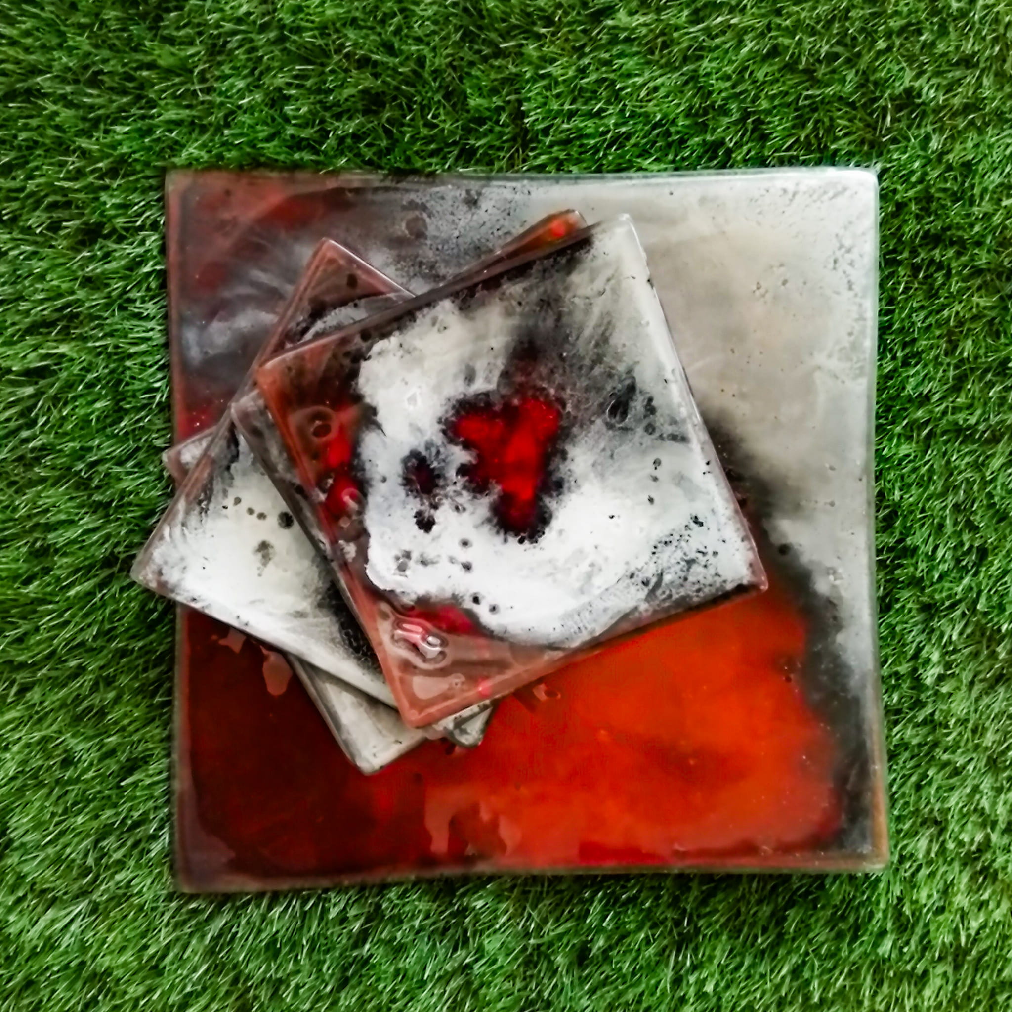 Na zdjeciu prezentujemy zestaw szklanych talerzy deserowych, który składa się z jednego dużego talerza o wymiarze 28cm x 28cm i 6szt małych talerzyków o wymiarze14cm x 14cm Grubosć szkła to 6mm. Talerze powstały metodą fusingu, barwione pomiędzy dwoma warstwami szkła przenikajacymi się barwami czekoladowego brązu, czerwieni I bieli. To wyrazisty zestaw, który podkresli każdy deser.