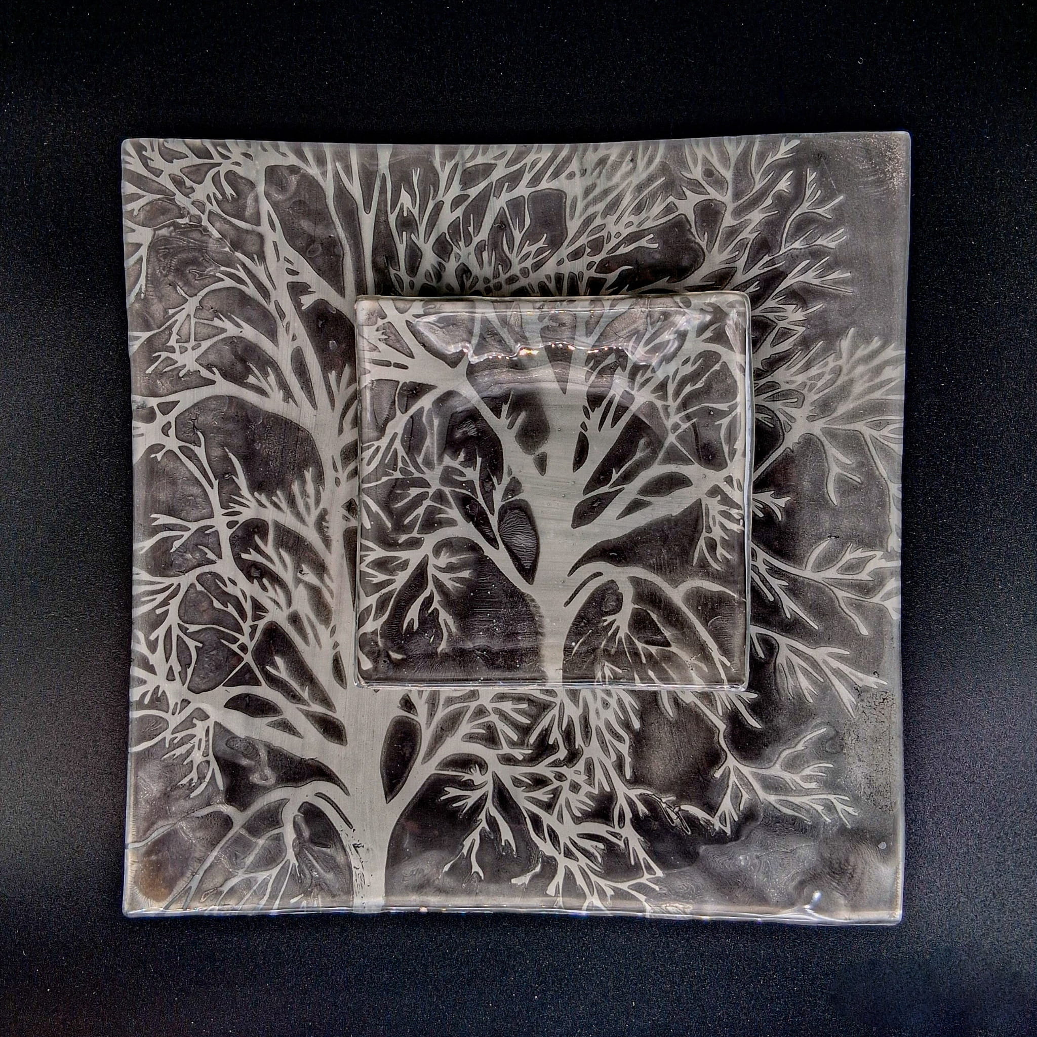 Na zdjeciu prezentujemy zestaw szklanych talerzy deserowych, który składa się z jednego dużego talerza o wymiarze 28cm x 28cm i 6szt małych talerzyków o wymiarze14cm x 14cm Grubosć szkła to 6mm. Talerze powstały metodą fusingu, barwione pomiędzy dwoma warstwami szkła z motywem drzewa w szarografitowych i białych odcieniach.