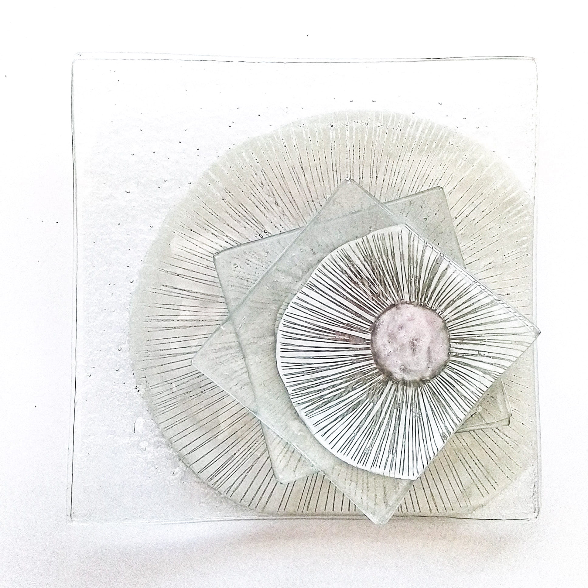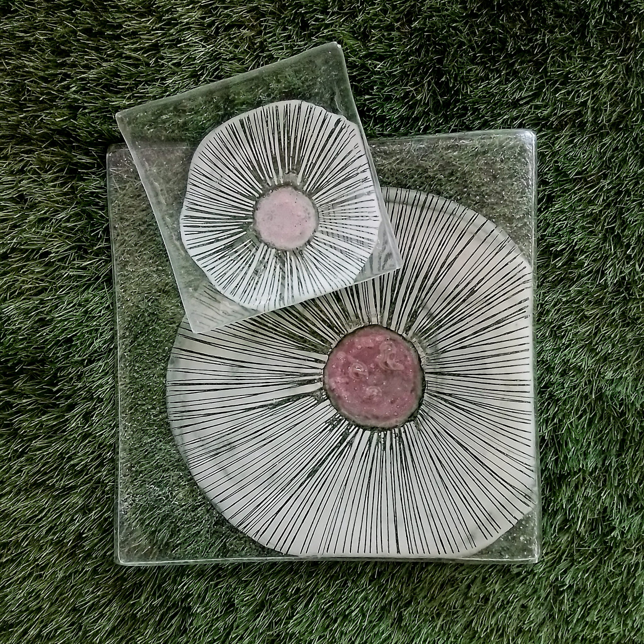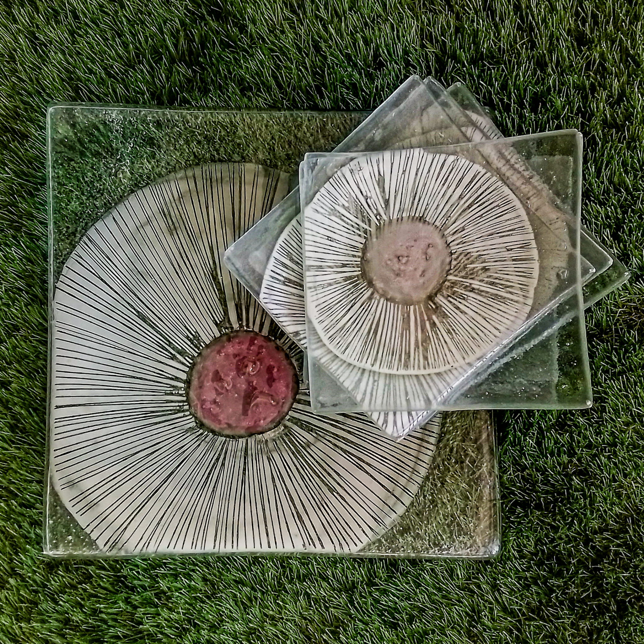 Na zdjeciu prezentujemy zestaw szklanych talerzy deserowych, który składa się z jednego dużego talerza o wymiarze 28cm x 28cm i 6szt małych talerzyków o wymiarze14cm x 14cm ze szkła grubości 6mm. Talerze powstały metodą fusingu, barwione pomiędzy dwoma warstwami szkła z abstrakcyjnym motywem kwiatowym. Na przezroczystej przestrzeni szkła delikatny, graficzny element z różowym środkiem.
