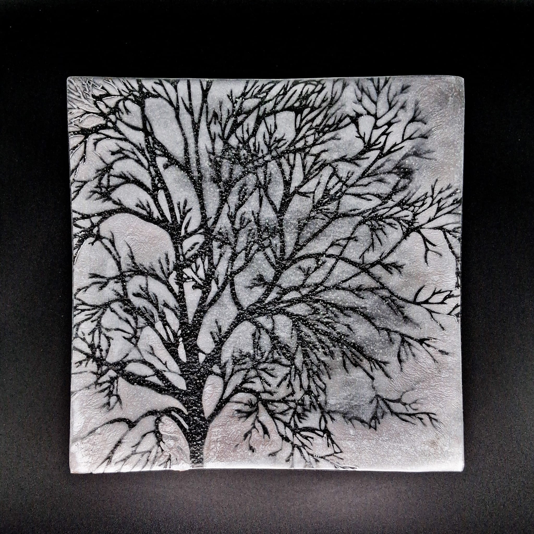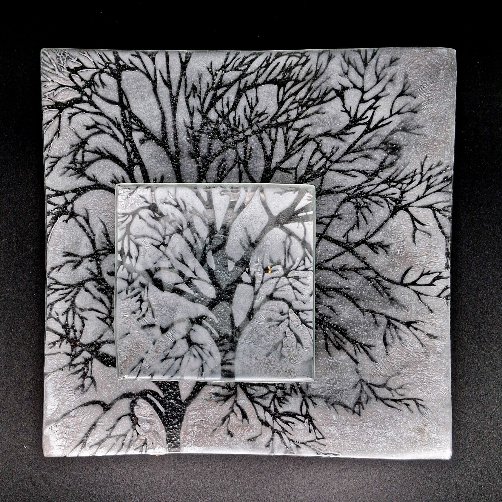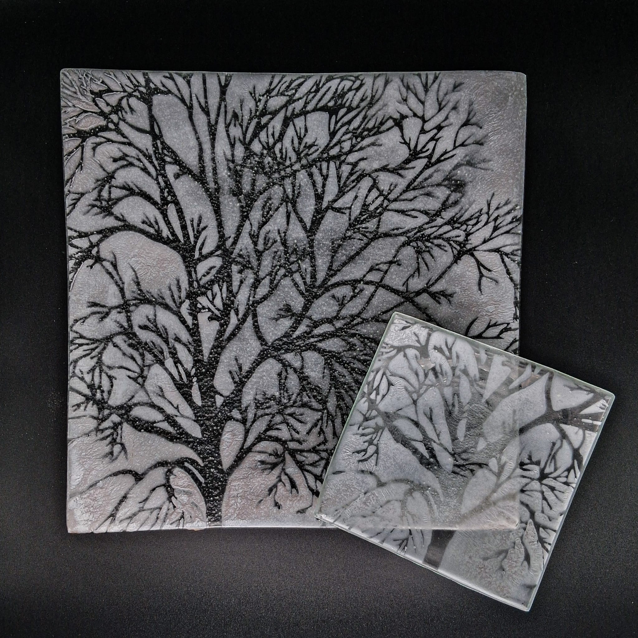 Na zdjeciu prezentujemy zestaw szklanych talerzy deserowych, który składa się z jednego dużego talerza o wymiarze 28cm x 28cm i 6szt małych talerzyków o wymiarze14cm x 14cm Grubosć szkła to 4 mm. Talerze powstały metodą fusingu, barwione powierzchniowo srebrnometaliczna powłoką z motywem drzewa. Piękny, delikatny wzór.