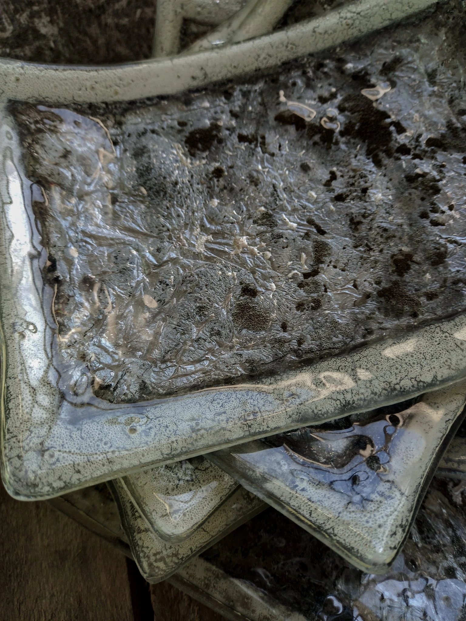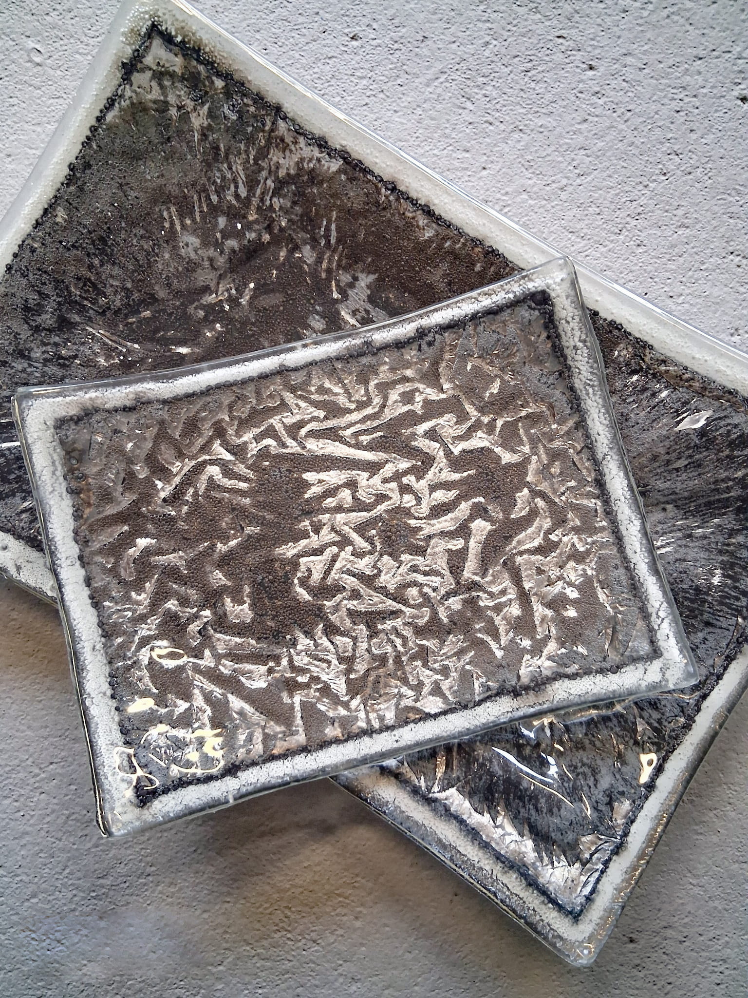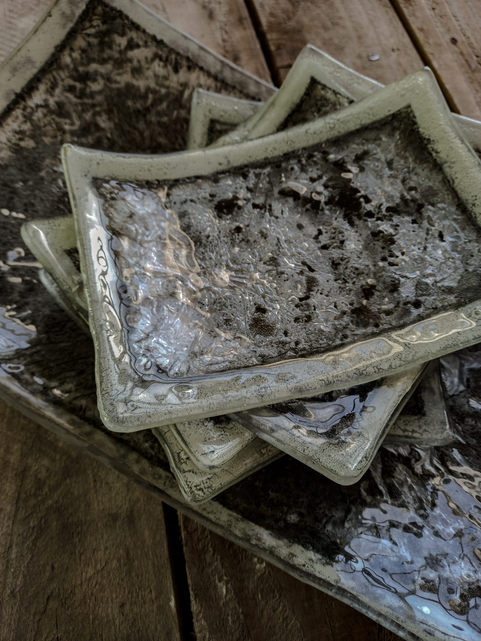 Na zdjeciu prezentujemy zestaw szklanych talerzy deserowych, który składa się z jednego dużego talerza o wymiarze 28cm x 19cm i 6szt małych talerzyków o wymiarze14cm x 19cm Grubosć szkła to 6mm. Talerze powstały metodą fusingu, barwione pomiędzy dwoma warstwami szkła z wtopionym metalem w kolorze srebra i farba w kolorze ekri. Całość wypalona w piecu, w wysokiej temperaturze I zapakowana ozdobne, ekologiczne pudełko.
