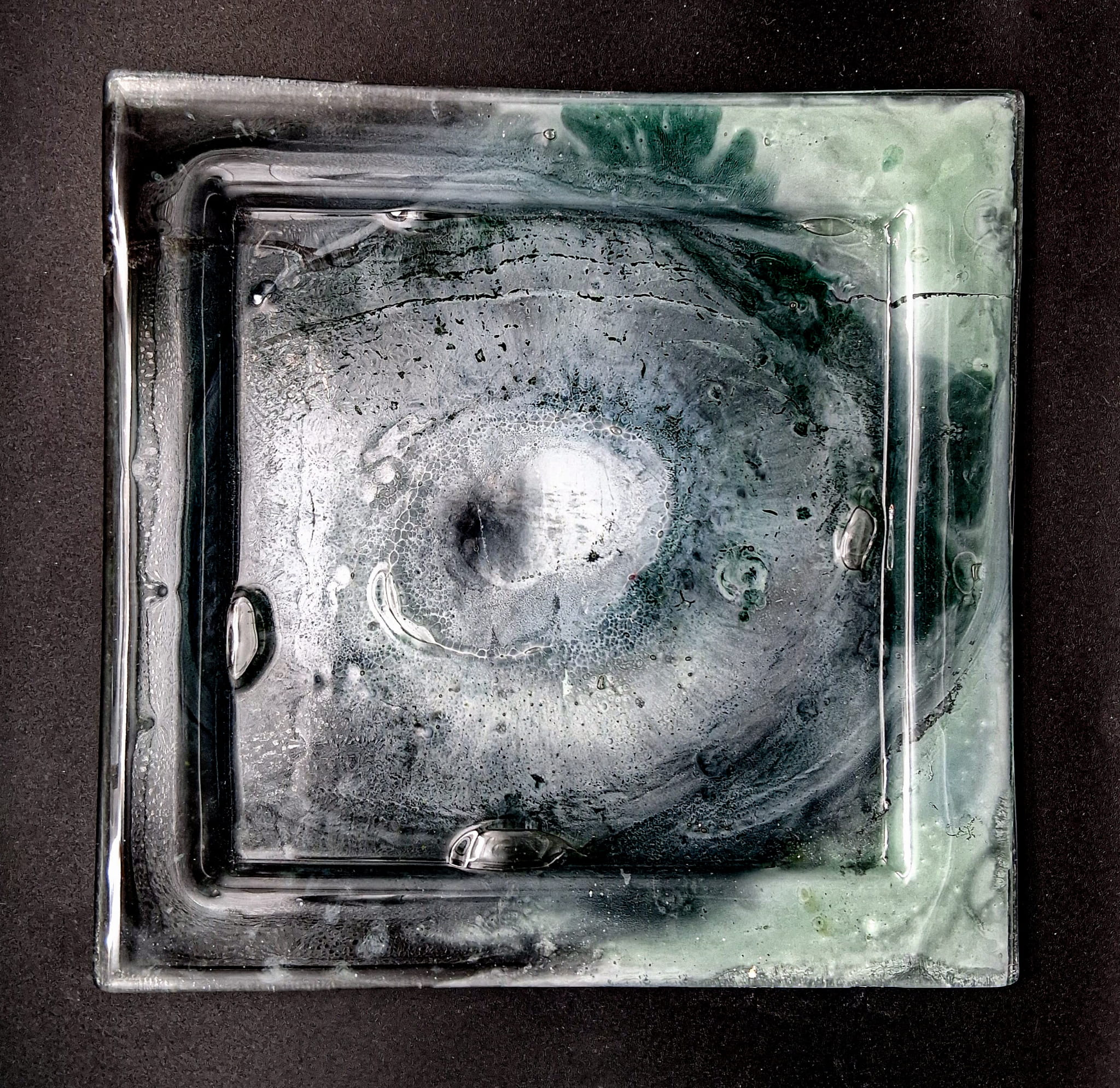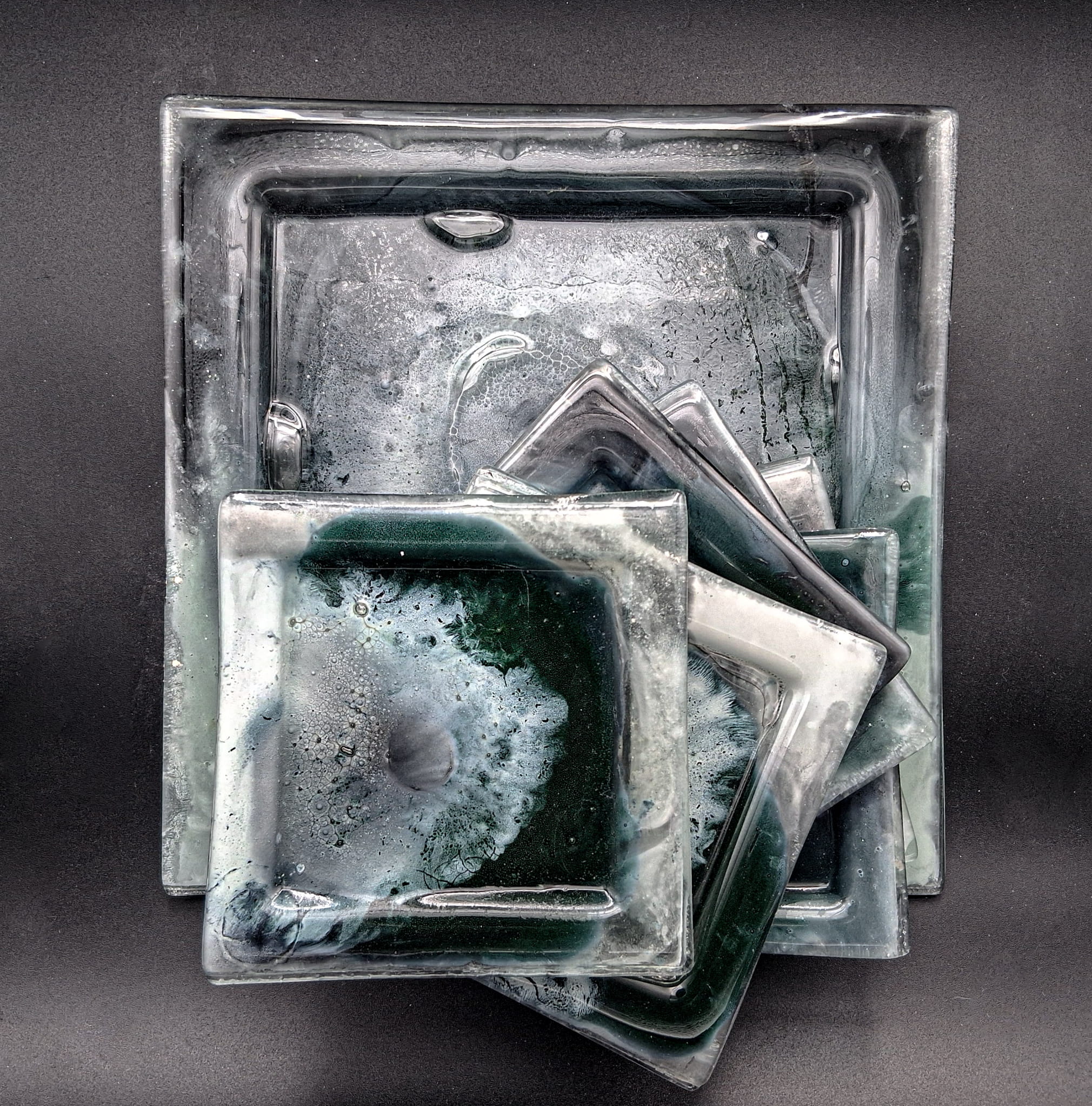 Na zdjeciu prezentujemy zestaw szklanych talerzy deserowych, który składa się z jednego dużego talerza o wymiarze 28cm x 28cm i 6szt małych talerzyków o wymiarze14cm x 14cm oraz grubosci szkła 6mm. Talerze powstały metodą fusingu, barwione pomiędzy dwoma warstwami szkła utrzymana w przenikających się kolorach ziemi. Komplet jest idealnym prezentem okolicznościowym zapakowanym w ekologiczne, ozdobne pudełko.