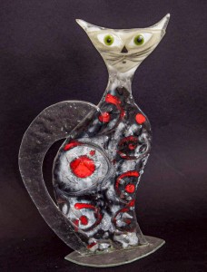 Szklana figurka kota wysokościowe 40 cm I szerokości 26cm. Figurka wykonana ze szkła wypalanego metodą fusingu, w odcieniach bie.i, czerni i przenikających się odcieni tych kolorów z dodatkiem czerwieni.