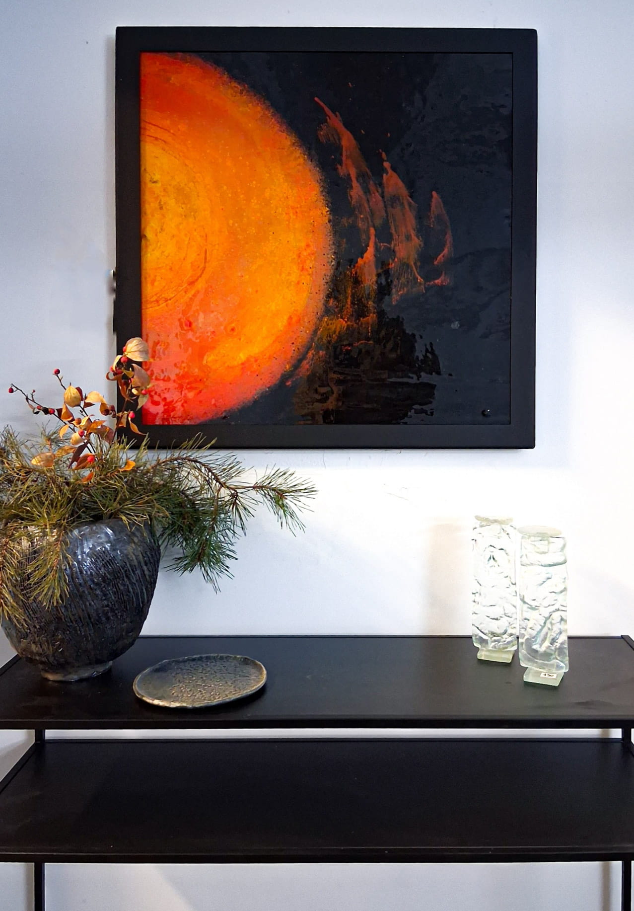 Obraz szklany o wymiarze 70cm x 70cm w metalowej, czarnej ramie o całkowitym wymiarze zewnętrznym 71,5 cm x 71,5cm. Szklo wypalone w piecu w tem 820 stopni, barwione pomiędzy dwoma warstwami szkła.