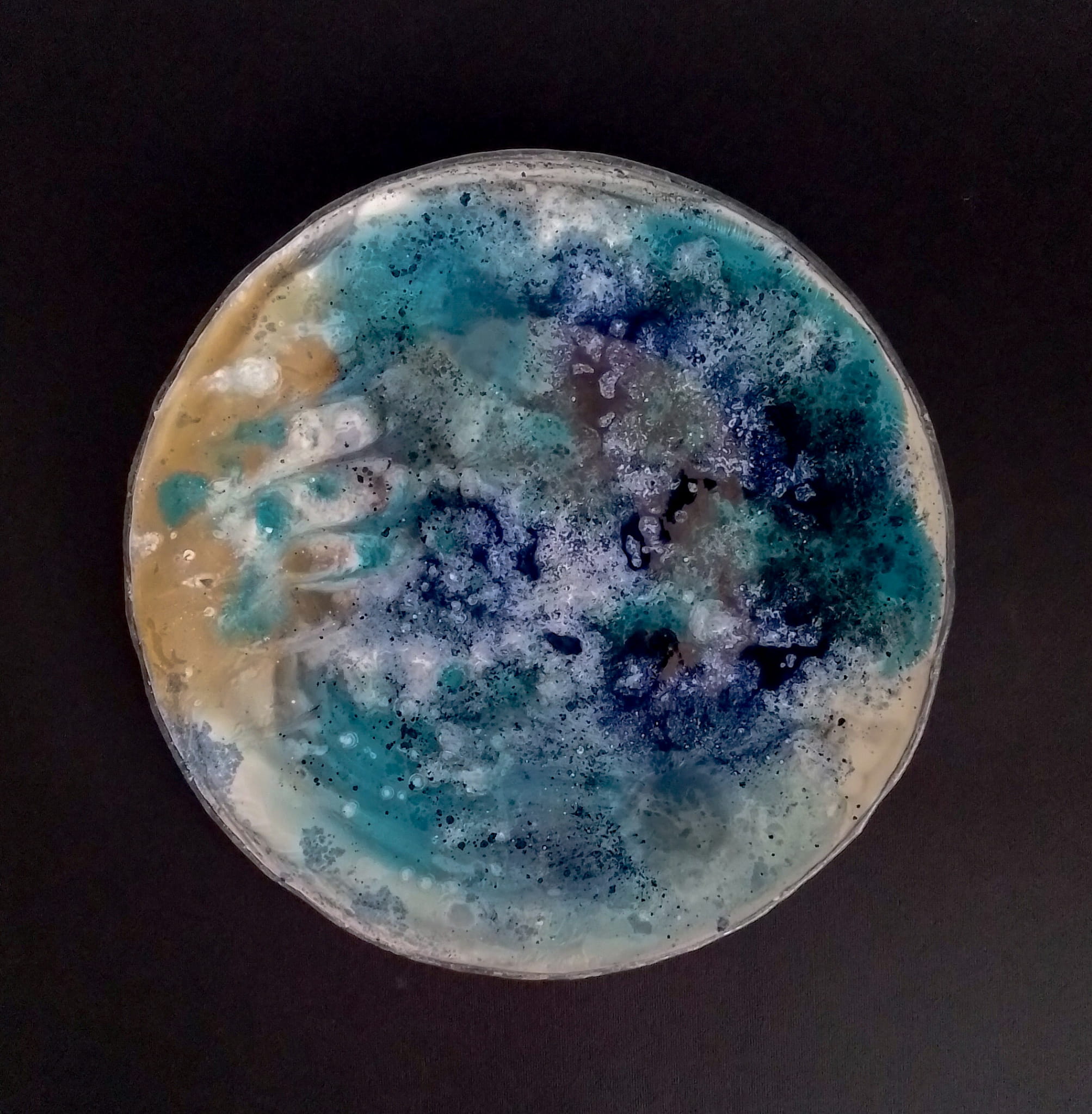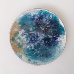 Szklana okrągła patera o średnicy 26cm i grubosci 3mm. Barwiona powierzchniowo i wypalona w piecu w wysokiej temperaturze. Kolorystyka utrzymana w tonacjach wody i ziemi.