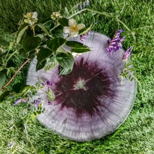 Szklana, okrągła patera o średnicy 27,5cm i grubosci 3mm. Barwiona powierzchniowo i wypalona w piecu, w wysokiej temperaturze w kolorach fioletu, różu i bieli. Całość zapakowana w ekologiczne, ozdobne pudełko.