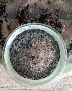 Mała, okrągła patera o średnicy 16 cm. Barwiona pomiędzy dwoma warstwami szkła z wtopionym metalem w kolorze srebra i farba w kolorze ekri. Całość wypalona w piecu, w wysokiej temperaturze.