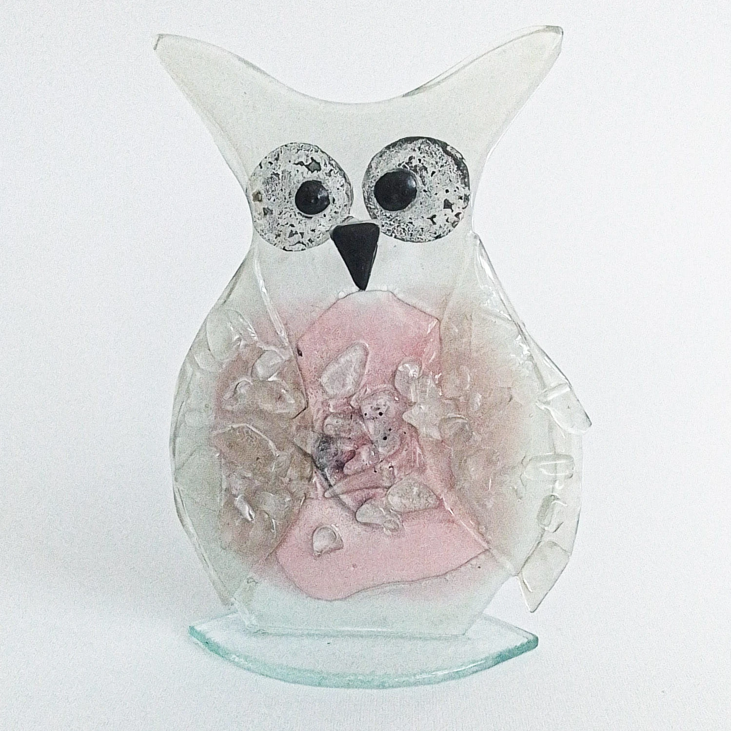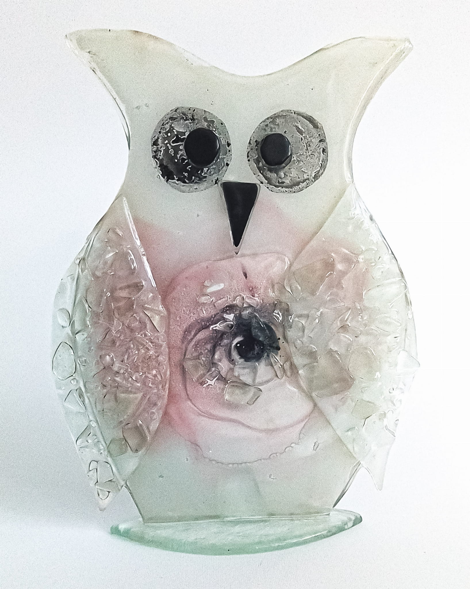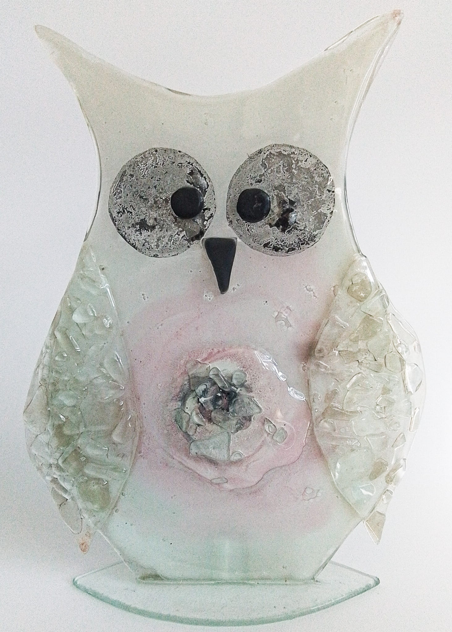 Szklana sowa wysokości 17,50cm, grubosci 6mm. Barwiona pomiędzy dwoma warstwami szkła. Sowa to idealny prezent np. z okazji Dnia Nauczyciela lub jako statuetka okolicznosciowa.