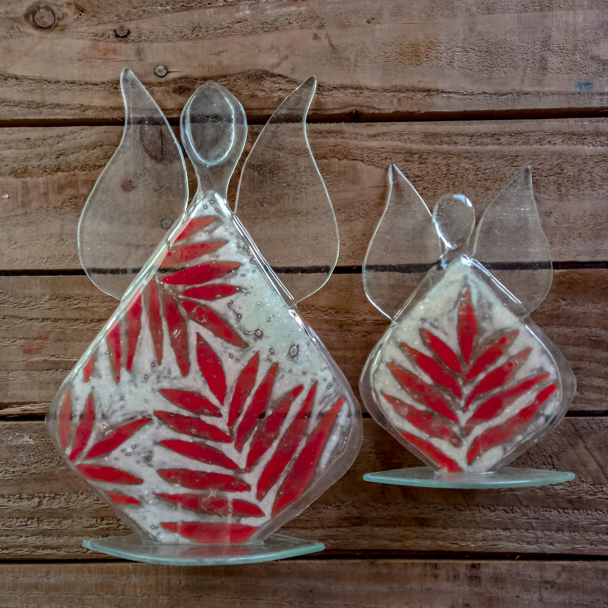 Szklany anioł stojący na podstawce to wyjątkowa dekoracja handmade wykonana ze szkła artystycznego. Delikatna, minimalistyczna forma połączona z intensywnym czerwonym motywem paprotki tworzy niepowtarzalny efekt wizualny, który przyciąga uwagę i nadaje wnętrzu charakteru.