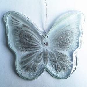 Szklany motyl z grubego przezroczystego szkła o wymiarze 17cm x 14cm, z srebrnoszarym wzorem. To idealny upominek zapakowany w ekologiczne, ozdobne pudełko.