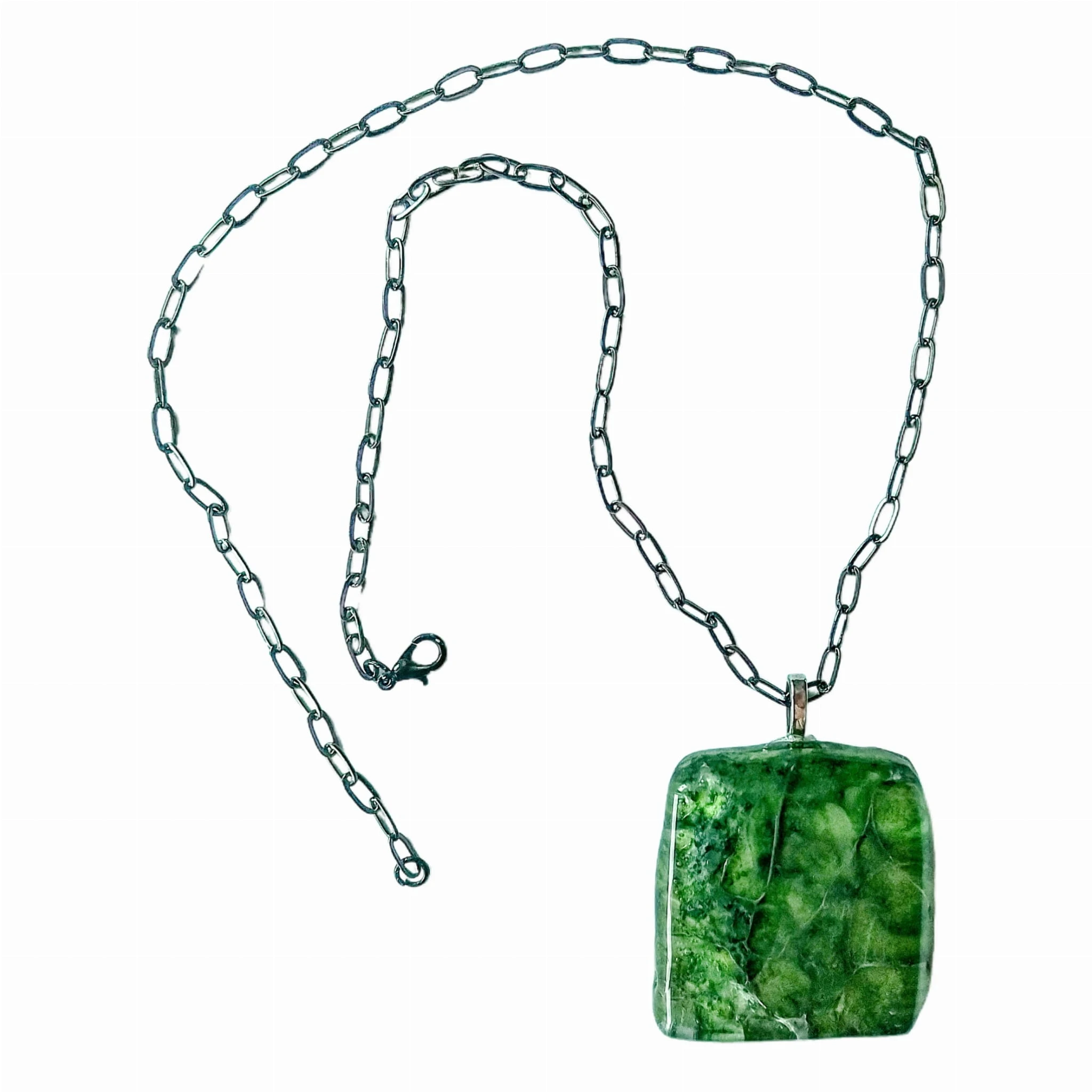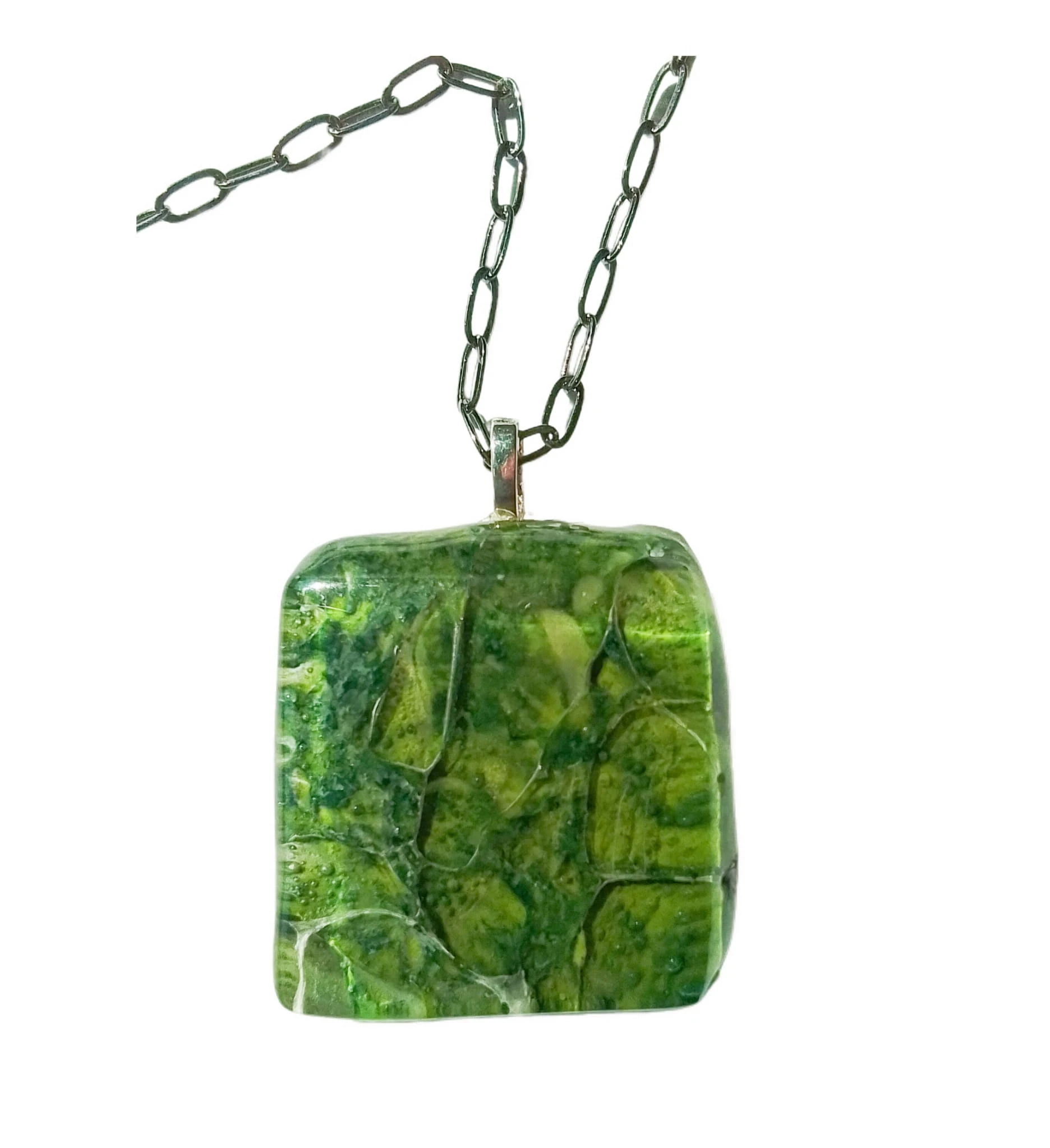 Zawieszka szklana powstała metoda fusingu. Barwiona pomiędzy dwoma warstwami szkła, o wymiarze 3,5cm x 4,00cm dwoma odcieniami zieleni. Zawieszka na ciemnym łańcuszku, długości 48 cm. Całość zamknięta w ozdobnym, ekologicznym pudelku o wymiarze 10,5cm x 10,5cm.