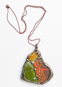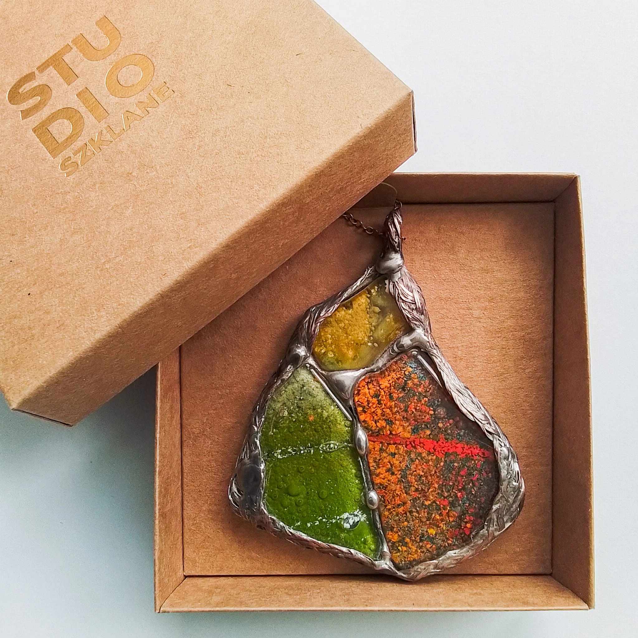 Zawieszka złożona z trzech szklanych kamieni, długości ok. 8 cm i szerokosci ok. 7,5 cm. Całość zawieszona na metalowym łańcuszku koloru miedzi o calkowitej dlugosci ok. 72 cm. Szklane elementy zostały połączone posrebrzaną, cynowaną miedzią oraz metalową plecionką. Ta niepowtarzalna mozaika dopełni każdą stylizację i nada jej niepowtarzalnego charakteru. Zawieszka zapakowana została w ekologiczne, ozdobne pudełko o wymiarze 10,5cm x 10,5cm.
