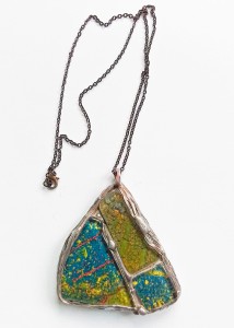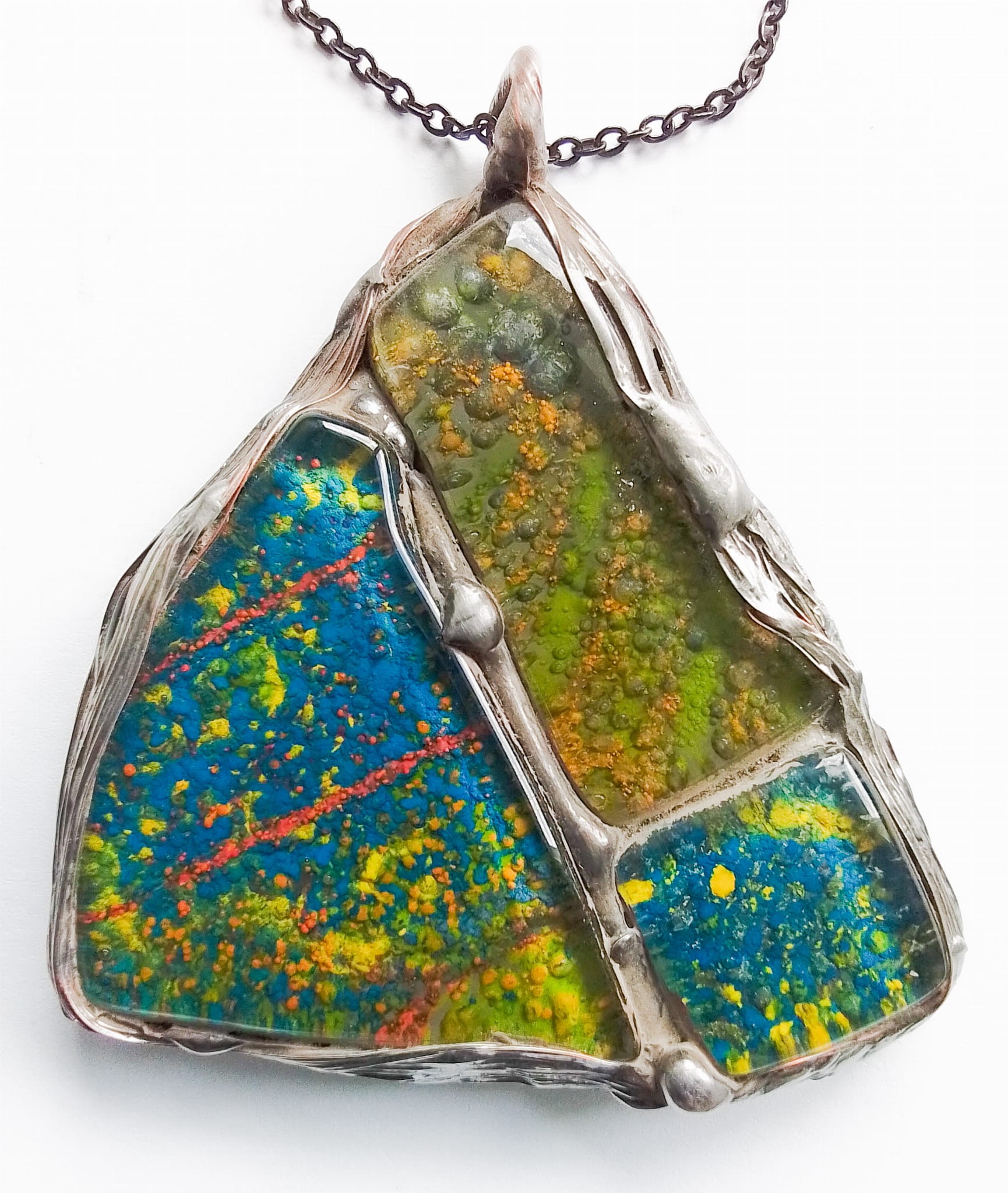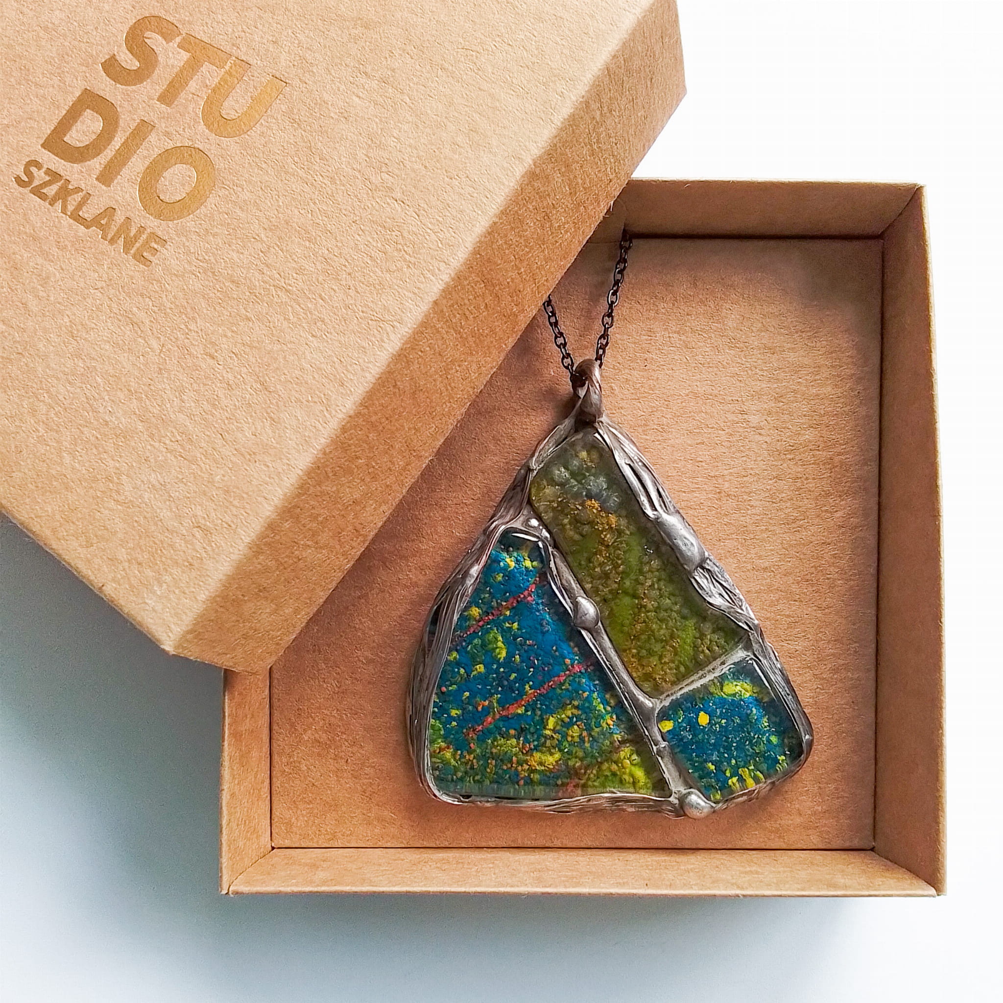Zawieszka złożona z trzechv szklanych kamieni, długości ok. 6 cm i szerokosci ok. 6cm. Całość zawieszona na metalowym, czarnym łańcuszku o calkowitej dlugosci ok. 55cm. Szklane elementy zostały połączone posrebrzaną, cynowaną miedzią. To piękny, niepowtarzalny akcent kolorystyczny każdej, stonowanej stylizacji. Zawieszka zapakowana została w ekologiczne, ozdobne pudełko o wymiarze 10,5cm x 10,5cm.