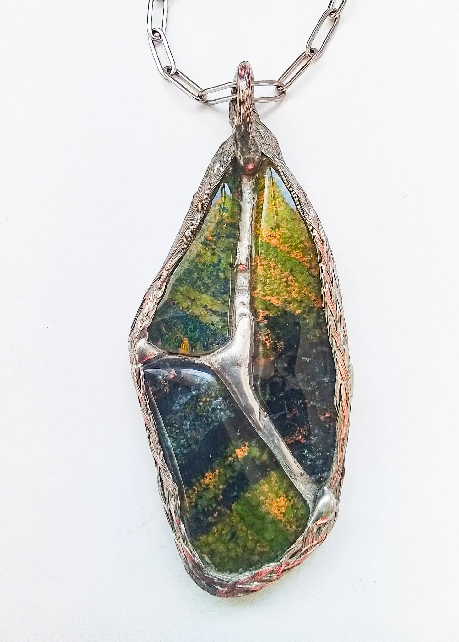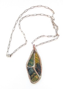 Zawieszka złożona z trzech szklanych kamieni, długości ok. 9 cm, szerokosci ok. 4,5 cm. Całość zawieszona na metalowym łańcuszku w kolorze srebra, o calkowitej dlugosci ok. 80 cm. Szklane elementy zostały połączone posrebrzaną, cynowaną ozdobną plecionką. To niepowtarzalny element w różnorodnych kolorach zieleni, szarości oraz czerni.