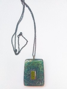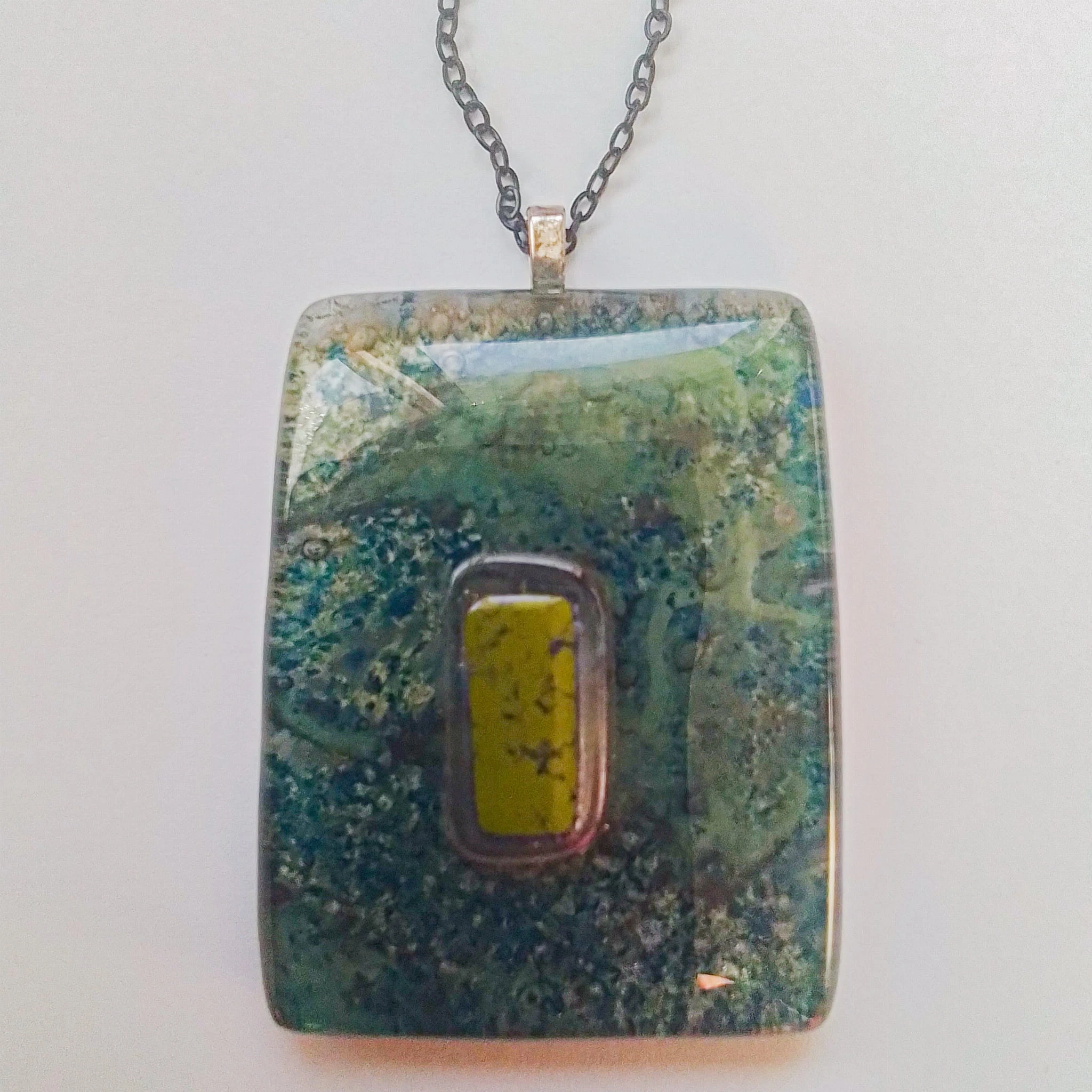Zawieszka szklana o wymiarze 5,5 cm x 4,00cm z grubego 6mm szkla. Barwiona pomiędzy dwoma szklanymi warstwami, z nałożonym małym, zielonym kamykiem,. Zawieszona na czarnym, metalowym łańcuszku o długości 46 cm