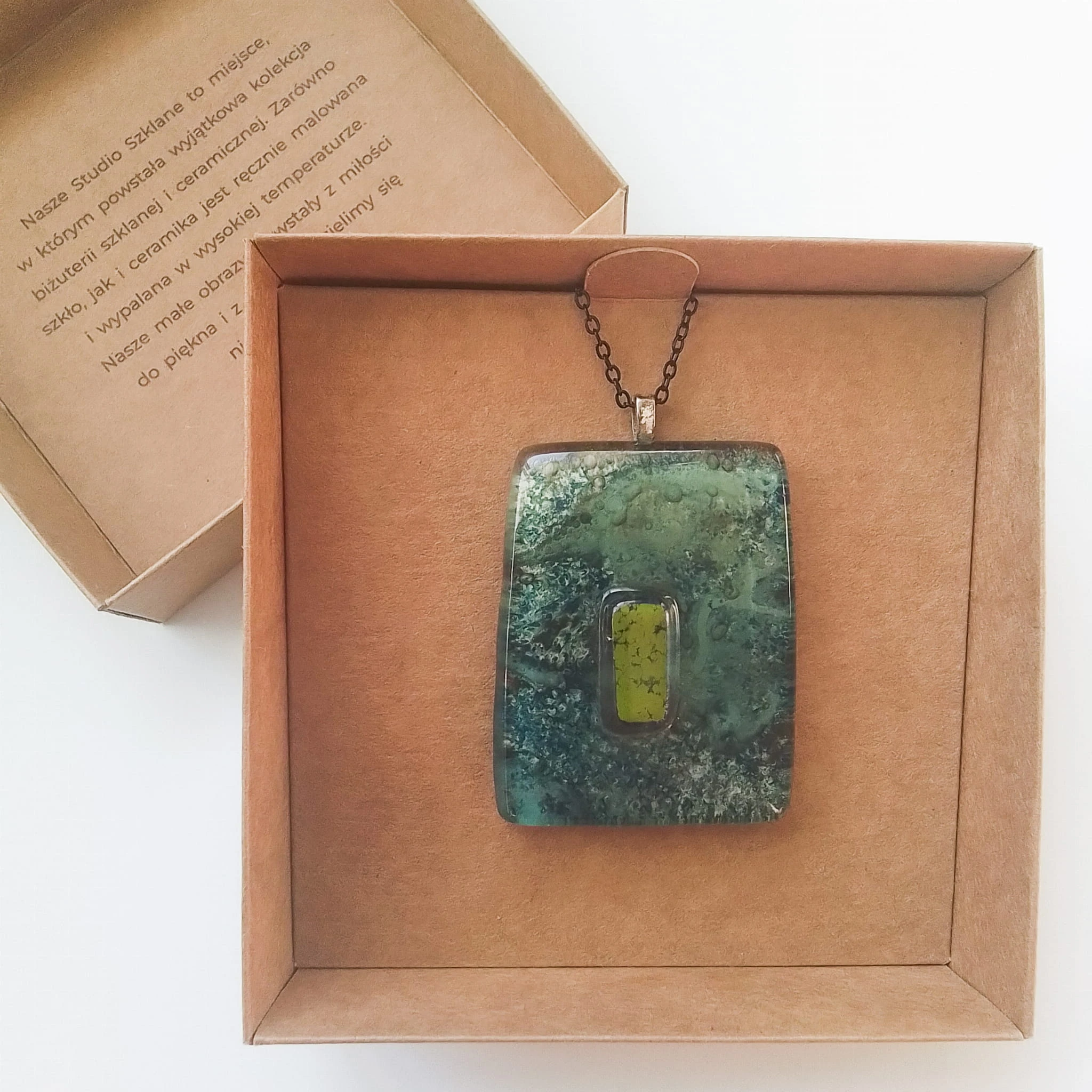 Zawieszka szklana o wymiarze 5,5 cm x 4,00cm z grubego 6mm szkla. Barwiona pomiędzy dwoma szklanymi warstwami, z nałożonym małym, zielonym kamykiem,. Zawieszona na czarnym, metalowym łańcuszku o długości 46 cm Całość zapakowana w ozdobne pudełko o wymiarze 10,5cm x 10,5cm.