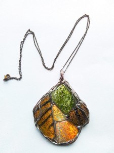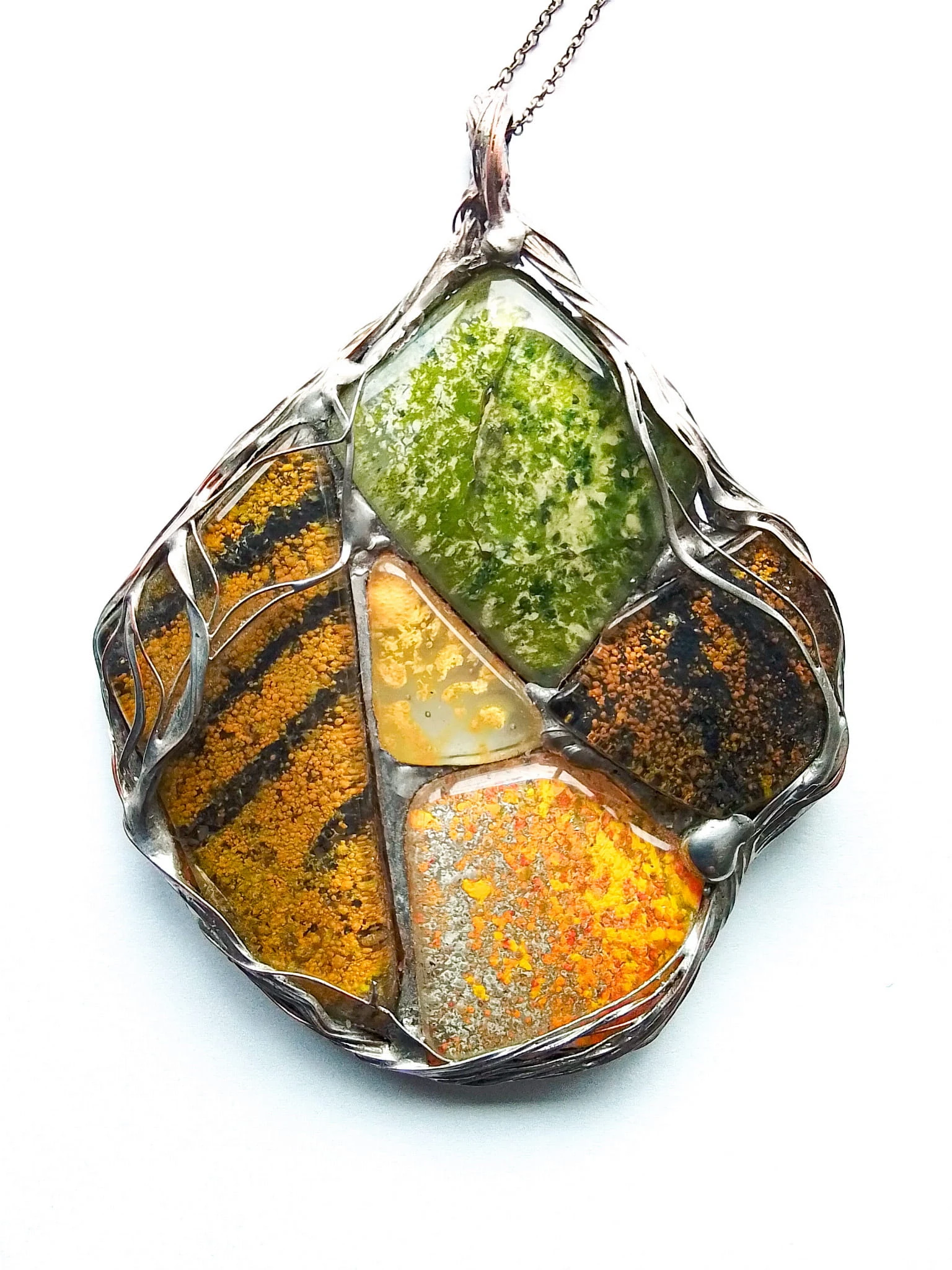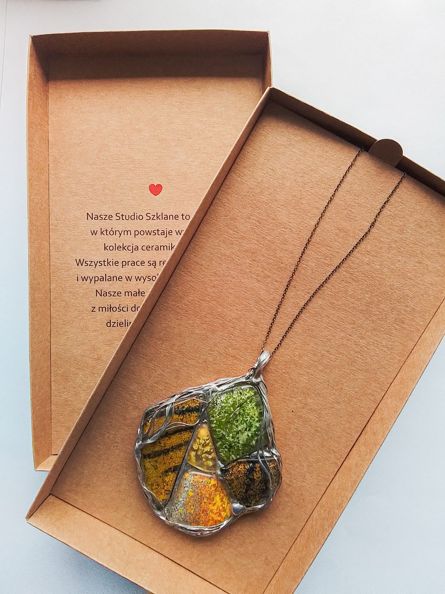Zawieszka złożona z pięciu szklanych kamieni, długości ok. 11 cm. Całość zawieszona na metalowym łańcuszku dlugosci ok. 74 cm w kolorze ciemnej zieleni. Szklane elementy zostały połączone posrebrzaną, cynowaną miedzią. Całość utrzymana w kolorach ziemi. Tworzy niepowtarzalną mozaikę, nadającą wyjatkowy klimat każdej stylizacji. Zawieszka zapakowana została w ekologiczne, ozdobne pudełko o wymiarze 24cm x 13cm.