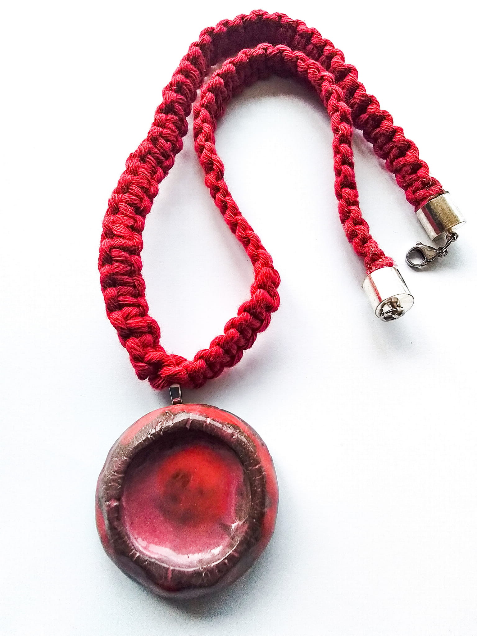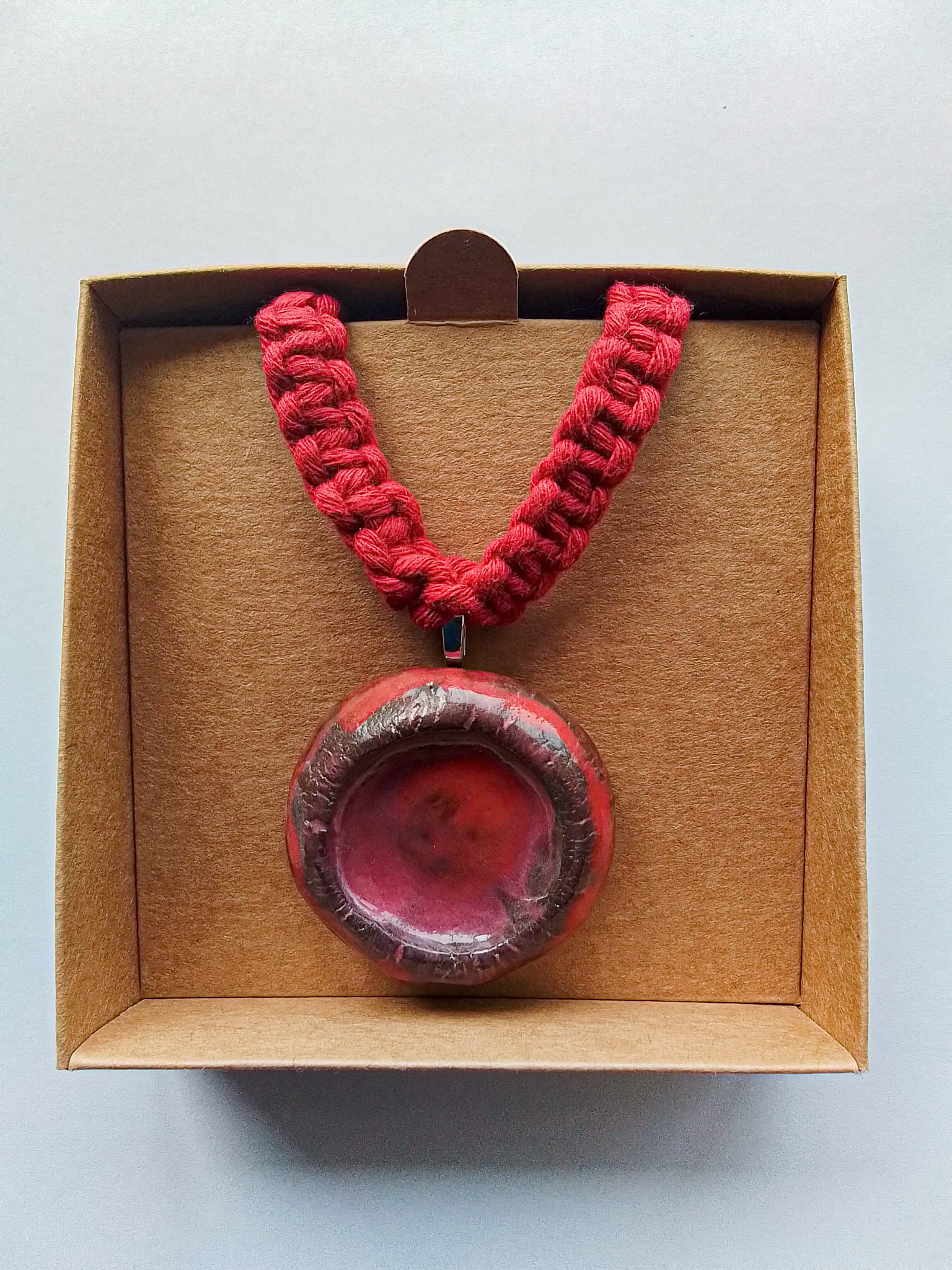 Zawieszka ceramiczna o średnicy 4,5 cm, grubosci ok. 1cm, na naturalnym zawieszeniu splecionym marramowym splocie w kolorze czerwieni. Całkowita długość zawieszenia wynosi 51cm. Zawieszka barwiona dwoma odcieniami czerwieni z przenikajacym od spodu, czekoladowym kolorem gliny. Całość zapakowana w ekologiczne pudełko ozdobne.